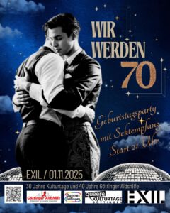 Hier könnt ihr euch noch mehr zu der Party informieren: https://lesbischwule-kulturtage-goettingen.de/party-01-11-2025/